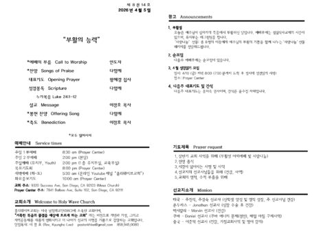 주일예배: 오후 2시 / 목요예배: 오후 8시